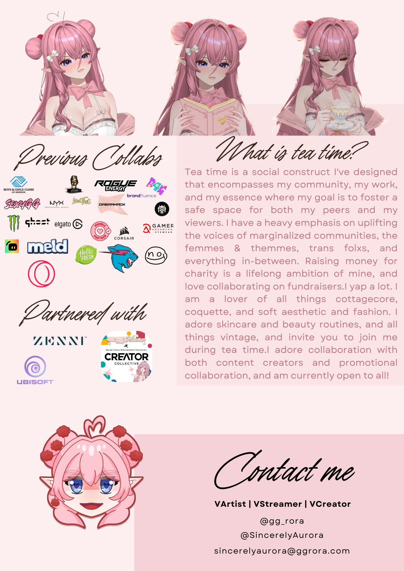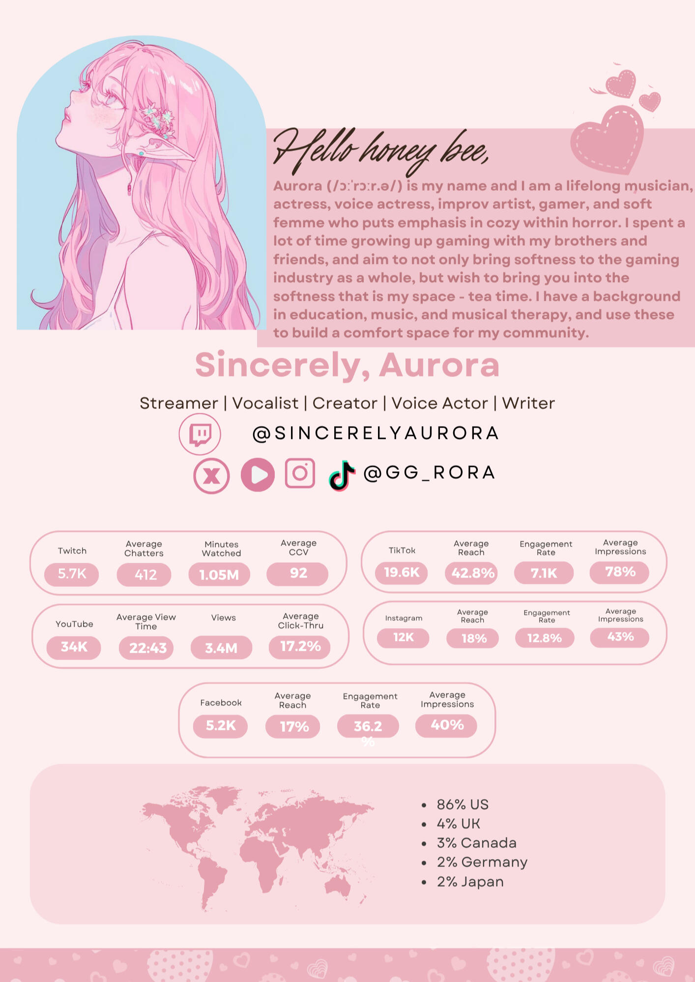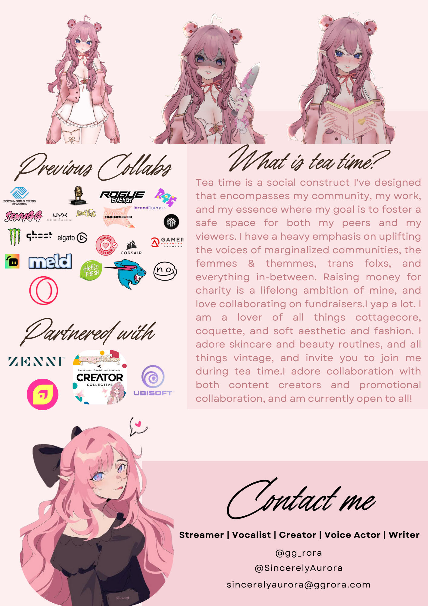 Aurora (/ɔːˈrɔːr.ə/) is my name and I am a lifelong musician, actress, voice actress, improv artist, gamer, and soft femme who puts emphasis in cozy within horror.I spent a lot of time growing up gaming with my brothers and friends, and aim to not only bring softness to the gaming industry as a whole, but wish to bring you into the softness that is my space - tea time. I have a background in education, music, and musical therapy, and use these to build a comfort space for my community.Tea time is a social construct I've designed that encompasses my community, my work, and my essence where my goal is to foster a safe space for both my peers and my viewers.I have a heavy emphasis on uplifting the voices of marginalized communities, the femmes & themmes, trans folxs, and everything in-between. Raising money for charity is a lifelong ambition of mine, and love of collaborating on fundraisers.I yap a lot. I am a lover of all things cottagecore, coquette, and soft aesthetic and fashion. I adore skincare and beauty routines, and all things vintage, and invite you to join me during tea time.I adore collaboration with both content creators and promotional collaboration, and am currently open to all!