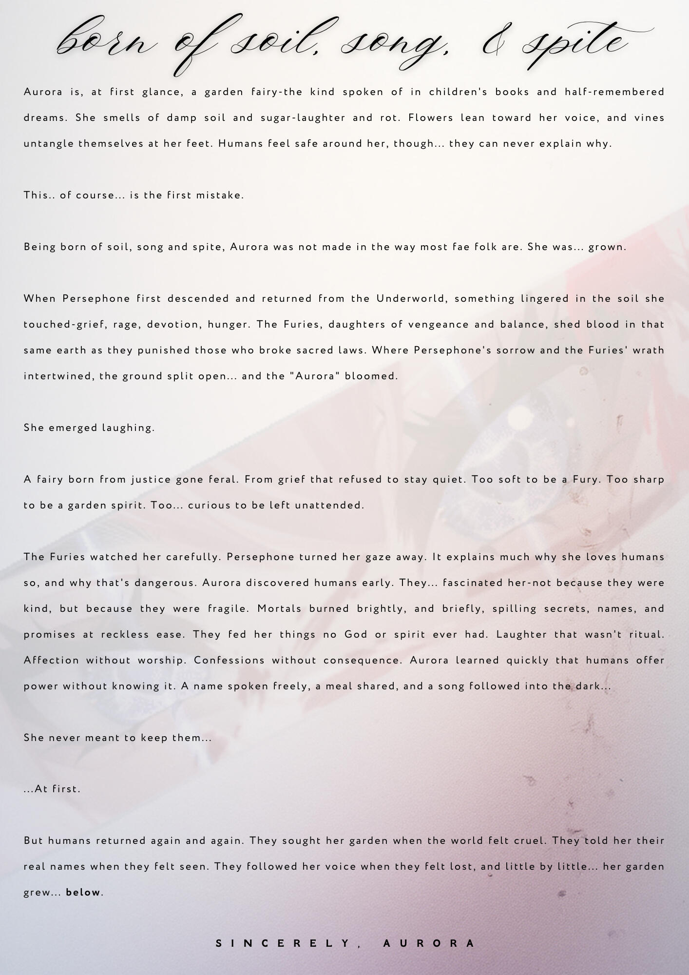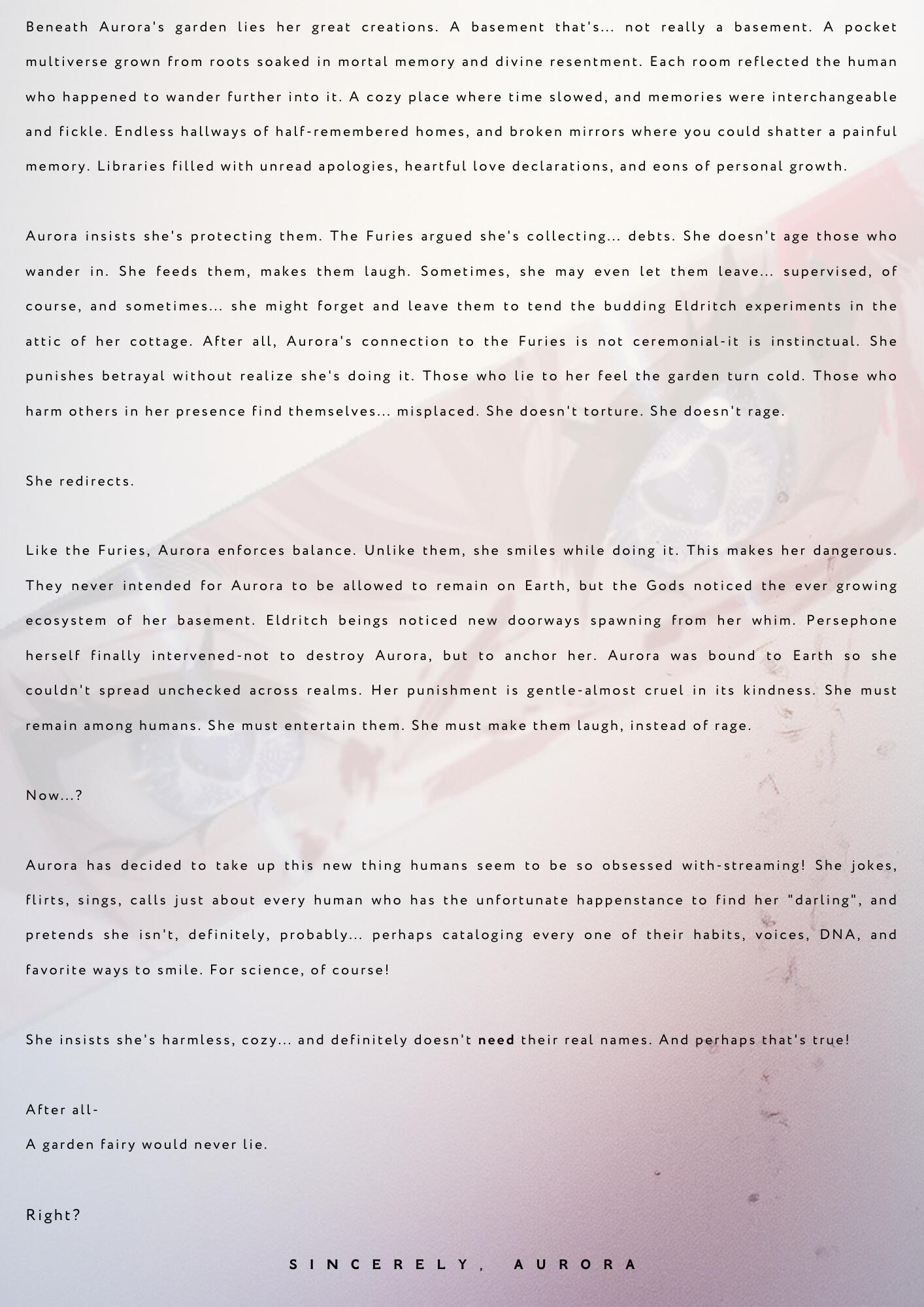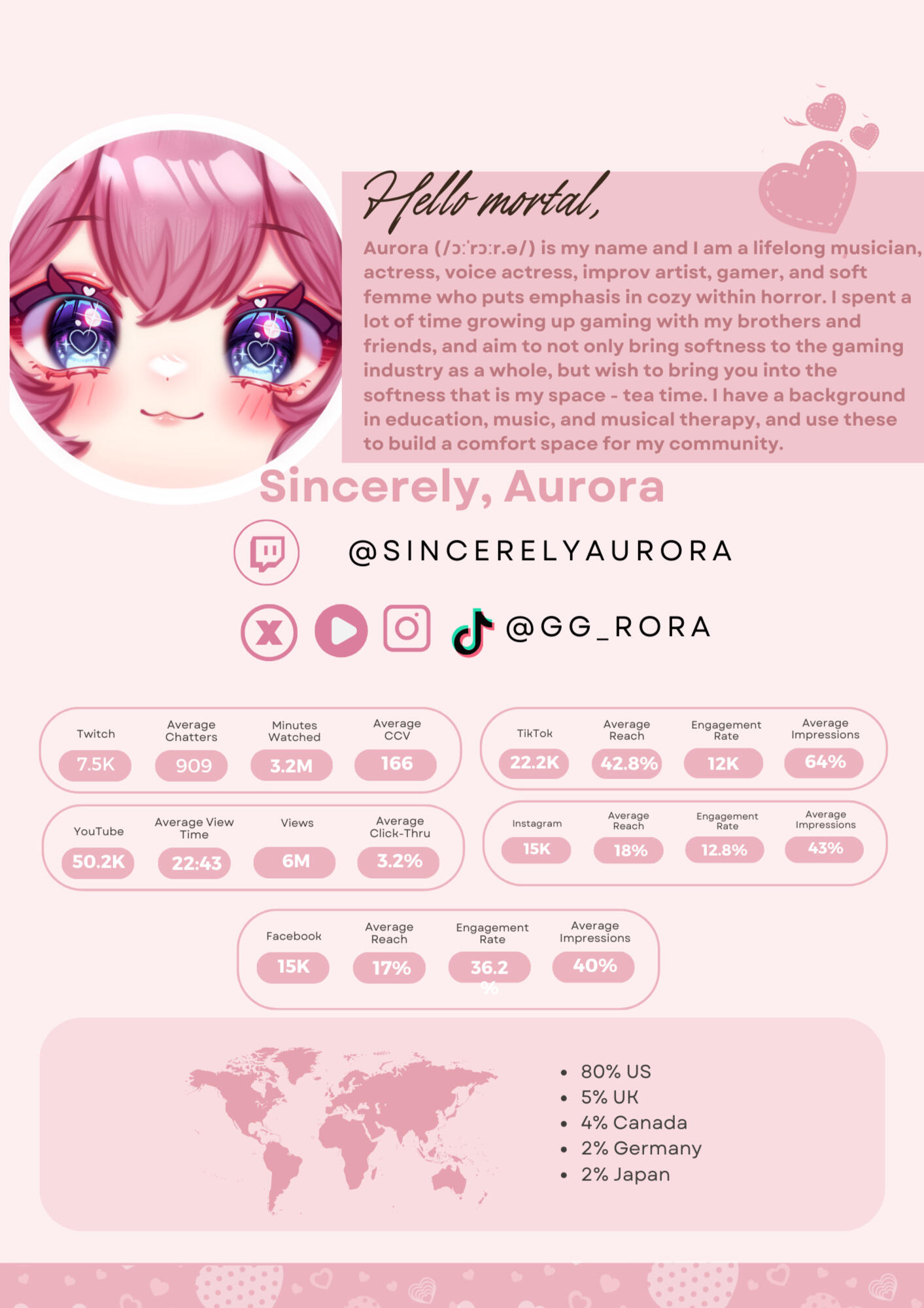 Aurora (/ɔːˈrɔːr.ə/) is my name and I am a lifelong musician, actress, voice actress, improv artist, gamer, and soft femme who puts emphasis in cozy within horror.I spent a lot of time growing up gaming with my brothers and friends, and aim to not only bring softness to the gaming industry as a whole, but wish to bring you into the softness that is my space - tea time. I have a background in education, music, and musical therapy, and use these to build a comfort space for my community.Tea time is a social construct I've designed that encompasses my community, my work, and my essence where my goal is to foster a safe space for both my peers and my viewers.I have a heavy emphasis on uplifting the voices of marginalized communities, the femmes & themmes, trans folxs, and everything in-between. Raising money for charity is a lifelong ambition of mine, and love of collaborating on fundraisers.I yap a lot. I am a lover of all things cottagecore, coquette, and soft aesthetic and fashion. I adore skincare and beauty routines, and all things vintage, and invite you to join me during tea time.I adore collaboration with both content creators and promotional collaboration, and am currently open to all!